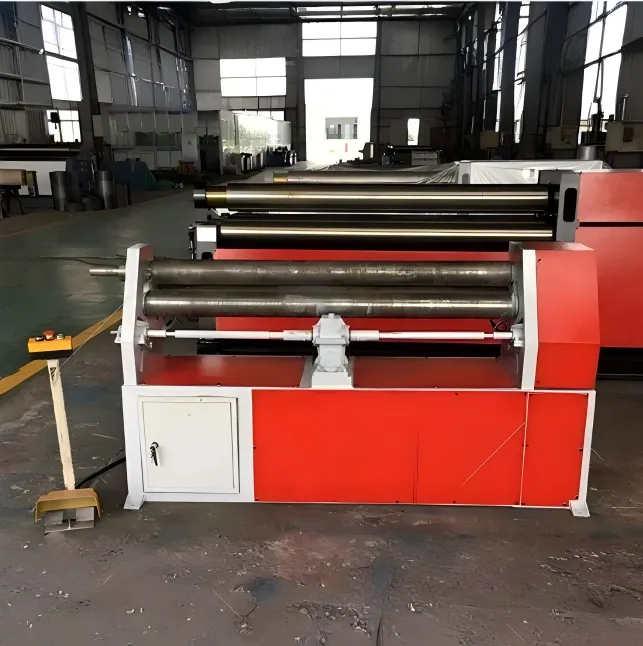 W11F-3×1000非对称式的卷板机结构形式为三辊非对称式,上辊为主传动,下辊垂直升降运动,以便夹紧板材,并通过下辊齿轮与上辊齿轮啮合,同时作为主传动;边辊作倾升降运动,具有预弯和卷圆双重功能。结构紧凑,操作维修方便。