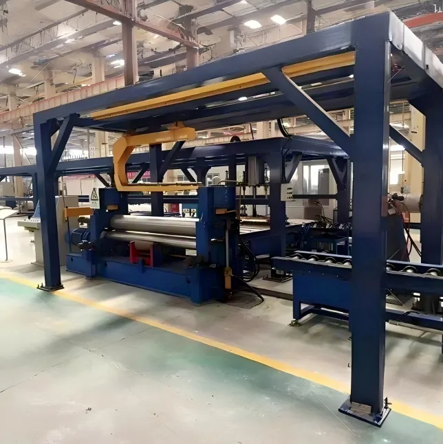 上辊万能式卷板机属于液压型三辊卷板机,用于常温状态下将各种容器用碳钢、低合金钢一次上料后不需调头即完成板材端部预弯、卷圆和矫圆等工序。上辊可以垂直移动、水平移动。预弯通过上辊水平移动,使上辊相对于下辊呈非对称位置来实现。滚圆时通过电动机、减速机带动两下辊进行。由于下辊的标高不变,所以便于进料和操作。提供详细的电气原理图,电气走线严格按图纸进行,每根连线两端的号码清晰完整,线端子排上贴有与连线号码相同的线号标记,而且在电器配线图及原理图作相应的标记。设备使用的电气全部采用名牌企业优质产品,电气保护器件(如电流继电器、空气开关等)在安装前进行严格的测试,并保证运行可靠。设备运行平稳、控制灵活、无卡阻、漏油和异常噪音。油漆表面平整光亮、漆模厚度均匀、无流痕漏喷等缺陷。翻倒架采用液压翻倒,速度较快。上辊垂直位移采用液压传动,水平移动采用机械传动速度较快。设备可靠性高,故障率低。