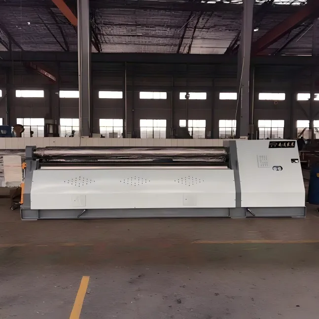 四辊卷板机用于制造压力容器、机械、水电、建筑等行业的筒体的预弯、卷圆,同时具有校圆、校平功能。上辊液压马达方式主传动,通过钢板与辊子之间的磨擦力带动下辊、侧辊转动,为卷圆提供扭矩。下辊、侧辊、翻倒架液压驱动。下辊垂直升降、侧辊倾斜弧线升降。预弯通过下辊上升夹住钢板,侧辊倾斜上升实现板材端部预弯。
